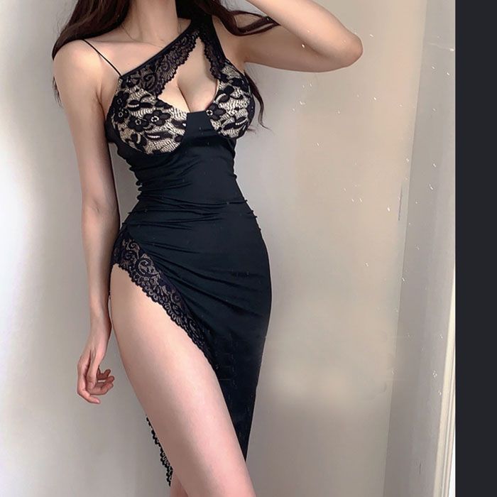 Slanted Shoulder Sleeveless Dress Lace Hollow Side Split Sexy Evening Dress [ad_1]